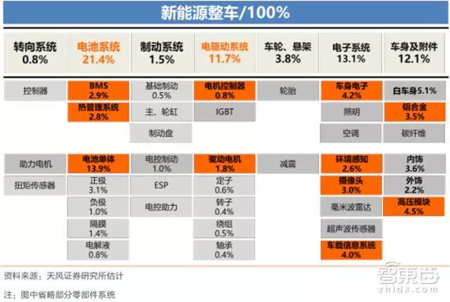 当然,有人欢喜就有人忧,传统燃油汽车中的动力和传动系统(成本占比近40%)、传统电子电气板块将随汽车新能源化被取代。