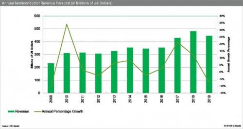 5月7日,根据IHS Markit最新数据,2019年全球半导体芯片行业的营收将下降7.4%。营收将从2018年的4,820亿美元下降至2019年的4,462亿美元。