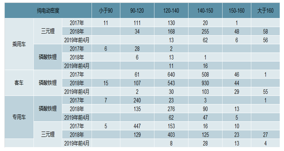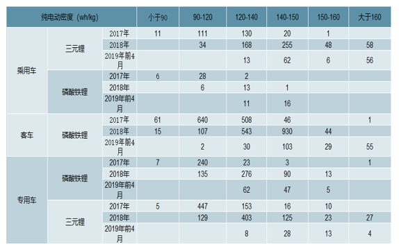 补贴政策标准延续,能量密度提升和安全性兼顾。新版补贴虽然延续高续航里程、高能量密度、低耗能水平的结构性补贴倾向,车型能量密度持续提升,兼顾安全性,部分低端新能源车型电池开始回归磷酸铁锂。从能量密度角度来看,2017年车型能量密度集中在90-140wh/kg,2018年提升至120-150wh/kg,2019年进一步提升,160wh/kg以上增速最快。