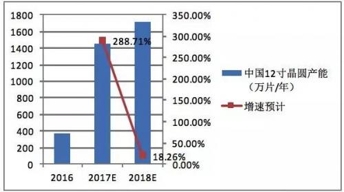 预计,2017-2018年中国大陆12寸晶圆产能超过1400万片每年,2018-2019年预计超过1700万片每年。