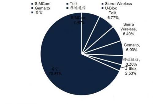 无线通信模块市场, 目前集中度不算高, 第一集团公司占据了全球约 30%的市场份额。 随着下游应用的崛起以及市场总规模的扩大, 一批专注于个别垂直应用领域的优质模块供应商开始浮现。